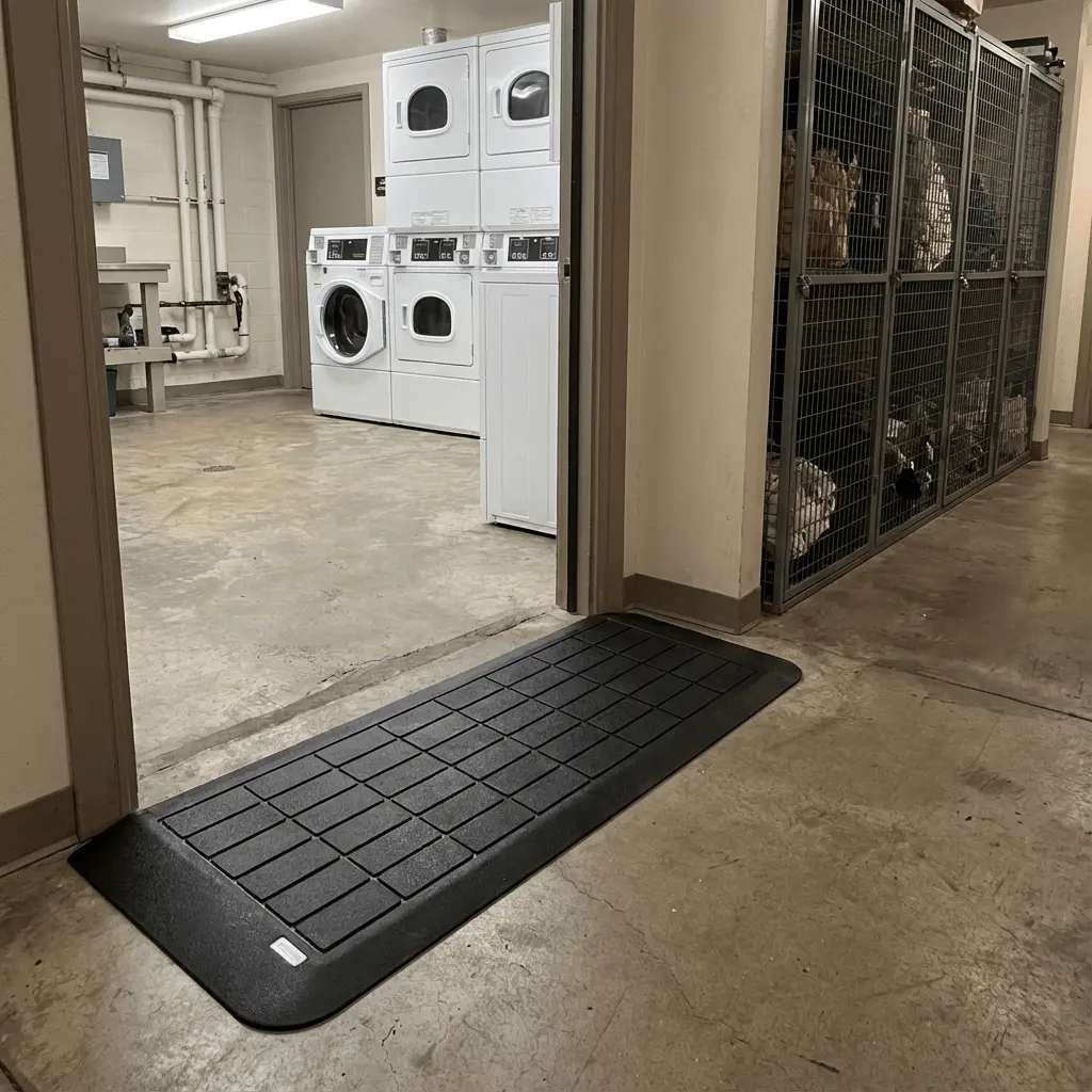 Laundry rooms, storage rooms, mailrooms, and shared hallways are all common interior spaces that often have raised thresholds or minor level changes that can be hazardous to residents. SafePath ADA compliant ramps help eliminate these hazards by providing a connection between different floor heights that is smooth, safe and ADA compliant. SafePath EZEdge™ Ramp System and BigHorn™ Ramps are perfect for high use interior spaces where residents frequently carry things, push carts, or use mobility devices. SafePath ramps match the flooring to hide the ramp, improve safety, and allow residents safe easy access around shared spaces. SafePath ramps are also durable, require little maintenance, and help property managers keep common areas all accessible and barrier-free for all residents