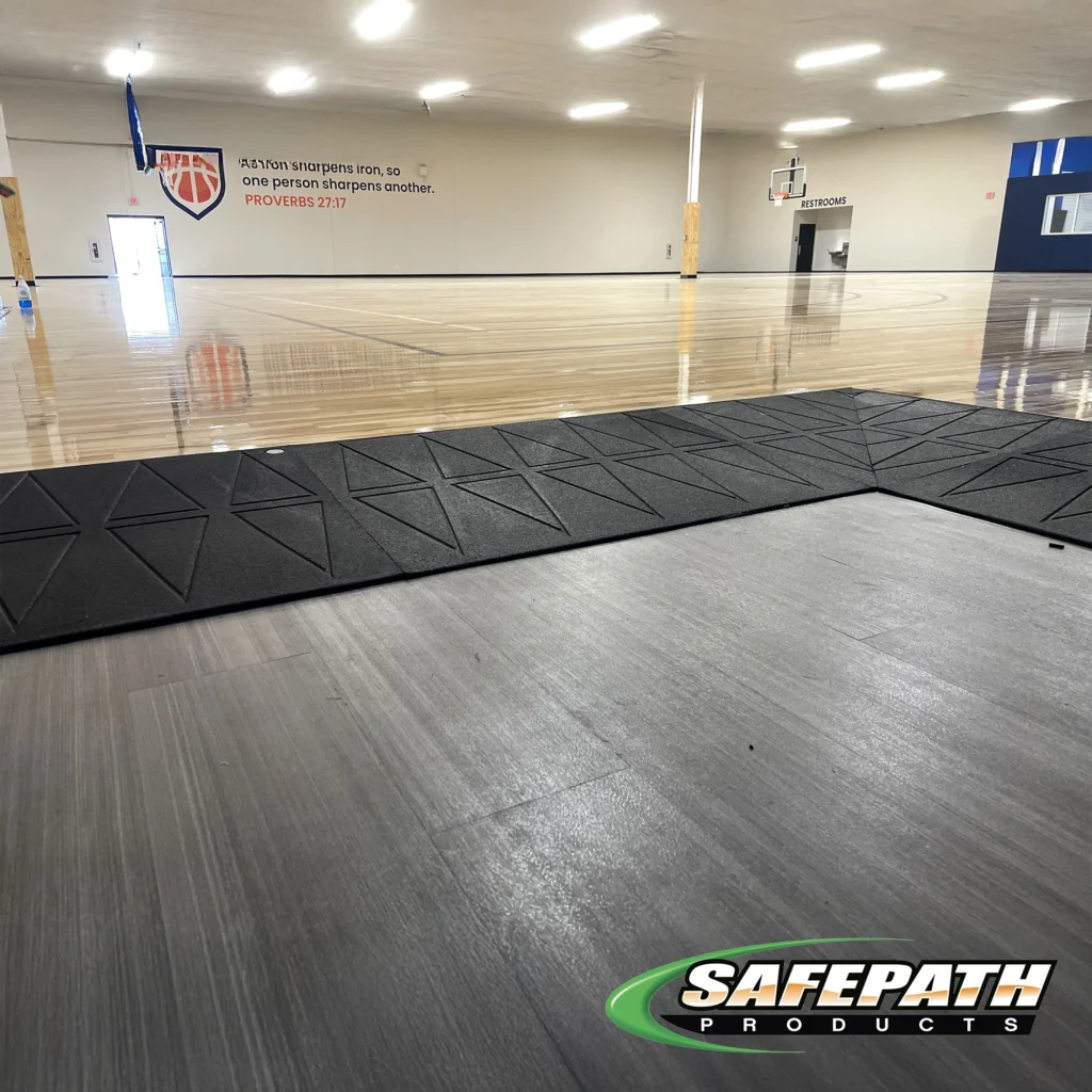 All athletic organizations have very busy gyms that get constant movement by athletes, students, staff, and visitors alike. Providing a barrier-free access solution at the entrances/exit of gyms is critical to preserving the health and safety of people using adaptive mobility aids by maintaining ADA compliance. SafePath ramping systems are engineered to provide a smooth, safe, and stable transition for wheelchair users, walkers, and strollers and do not impede on the performance and functionality of gymnasiums’ sports flooring. Our ramps also seamlessly integrate with your current gym layout and deliver a consistent level of traction and durability through the rigors of high-traffic events. In addition to providing a means for creating an inclusive, welcoming space, SafePath ramps are designed to support the performance characteristics that indoor athletes require while practicing, playing tournaments, or participating in community activities.